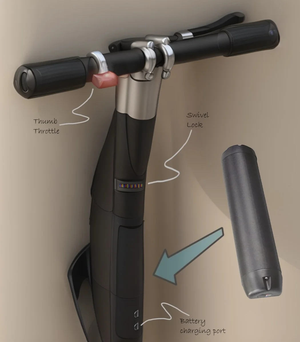 At just under 20lbs, the Nostrowia electric handcycle is designed to be able to be easily transported, attached, and detached, by an independent user. The hub motor is controlled by a thumb throttle, and the spring-loaded front shelf serves both for easy access to the user’s belongings as well as to add traction to the front wheel.